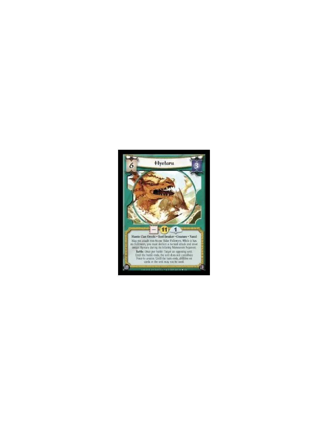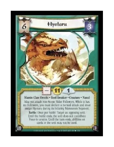 Mantis Clan Orochi · Reef Breaker · Creature · Naval. May not attach non-Storm Rider Followers. While it has no Followers, you must declare a normal attack and must assign Hyotaru during its Infantry Maneuvers Segment. Battle: Once per battle: Target an opposing unit. Until the battle ends, the unit does not contribute Force to armies. Until the turn ends, abilities on cards in the unit may not be used.