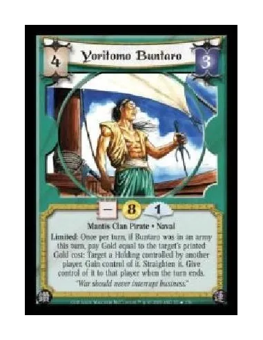 Mantis Clan Pirate · Naval. Limited: Once per turn, if Buntaro was in an army this turn, pay Gold equal to the target's printed Gold cost: Target a Holding controlled by another player. Gain control of it. Straighten it. Give control of it to that player when the turn ends.