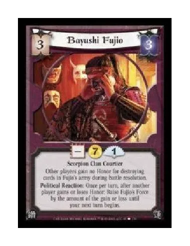 Scorpion Clan Courtier. Other players gain no Honor for destroying cards in Fujio's army during battle resolution. Political Reaction: Once per turn, after another player gains or loses Honor: Raise Fujio's Force by the amount of the gain or loss until your next turn begins