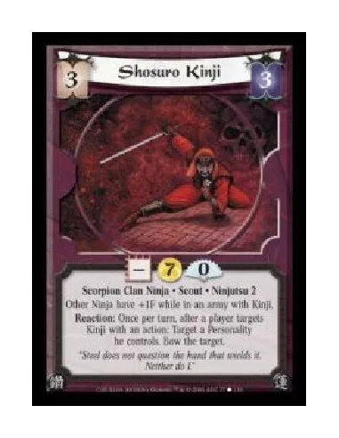 Scorpion Clan Ninja · Scout · Ninjutsu 2. Other Ninja have +1F while in an army with Kinji. Reaction: Once per turn, after a player targets Kinji with an action: Target a Personality he controls. Bow the target.