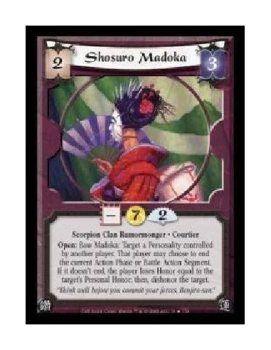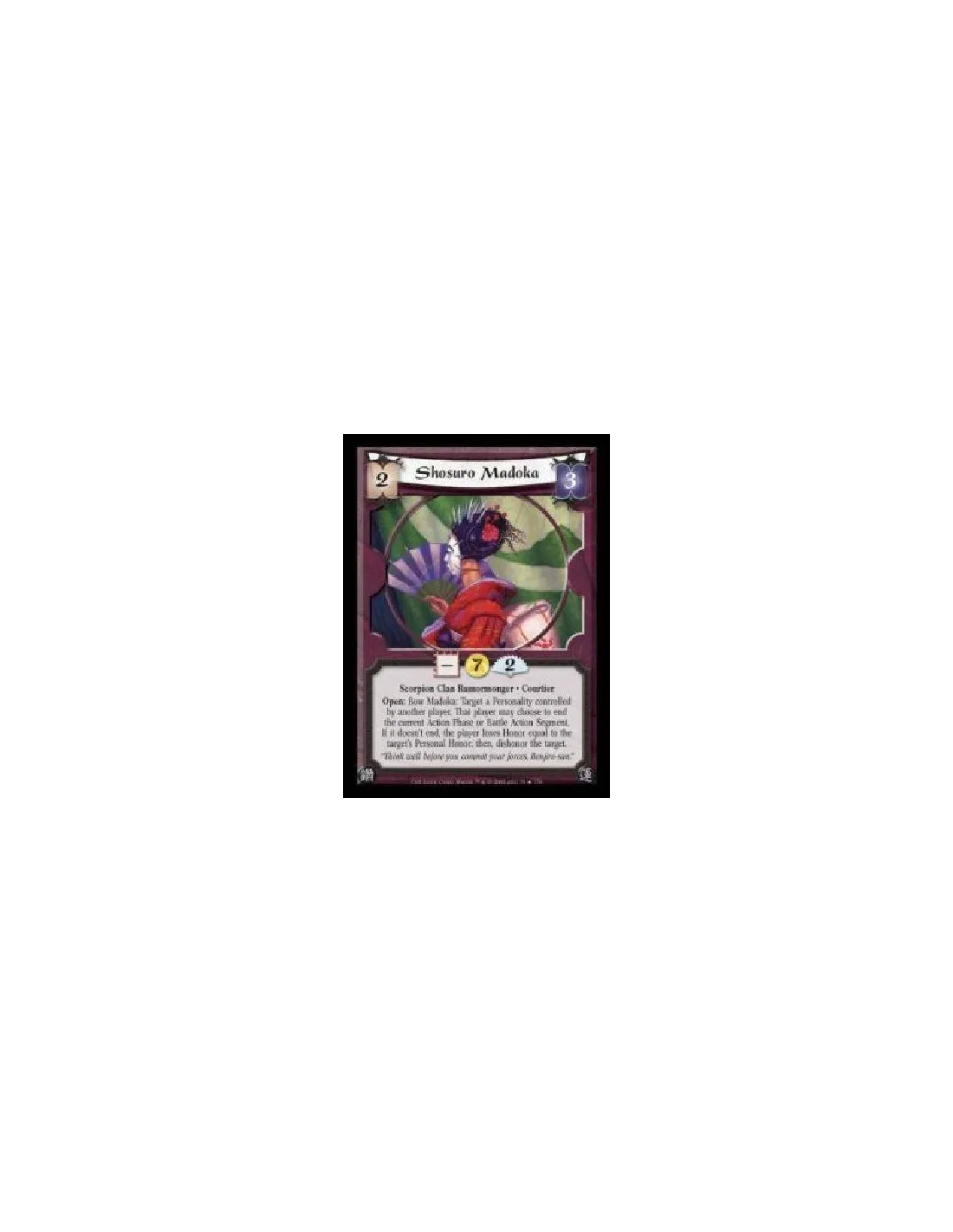 Scorpion Clan Rumormonger · Courtier. Open: Bow Madoka: Target a Personality controlled by another player. That player may choose to end the current Action Phase or Battle Action Segment. If it doesn't end, the player loses Honor equal to the target's Personal Honor; then, dishonor the target.