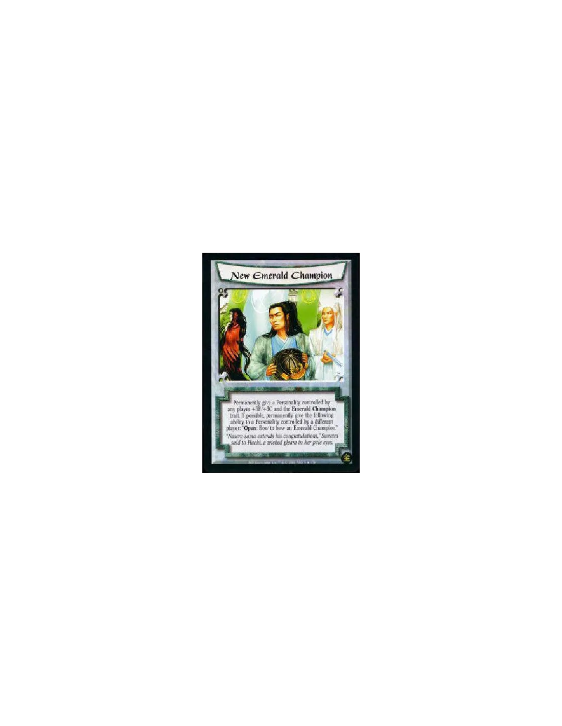 Permanently give a Personality controlled by any player +3F/+3C and the Emerald Champion trait. If possible, permanently give the following ability to a Personality controlled by a different player from the first one: "Open: Bow to bow an Emerald Champion."