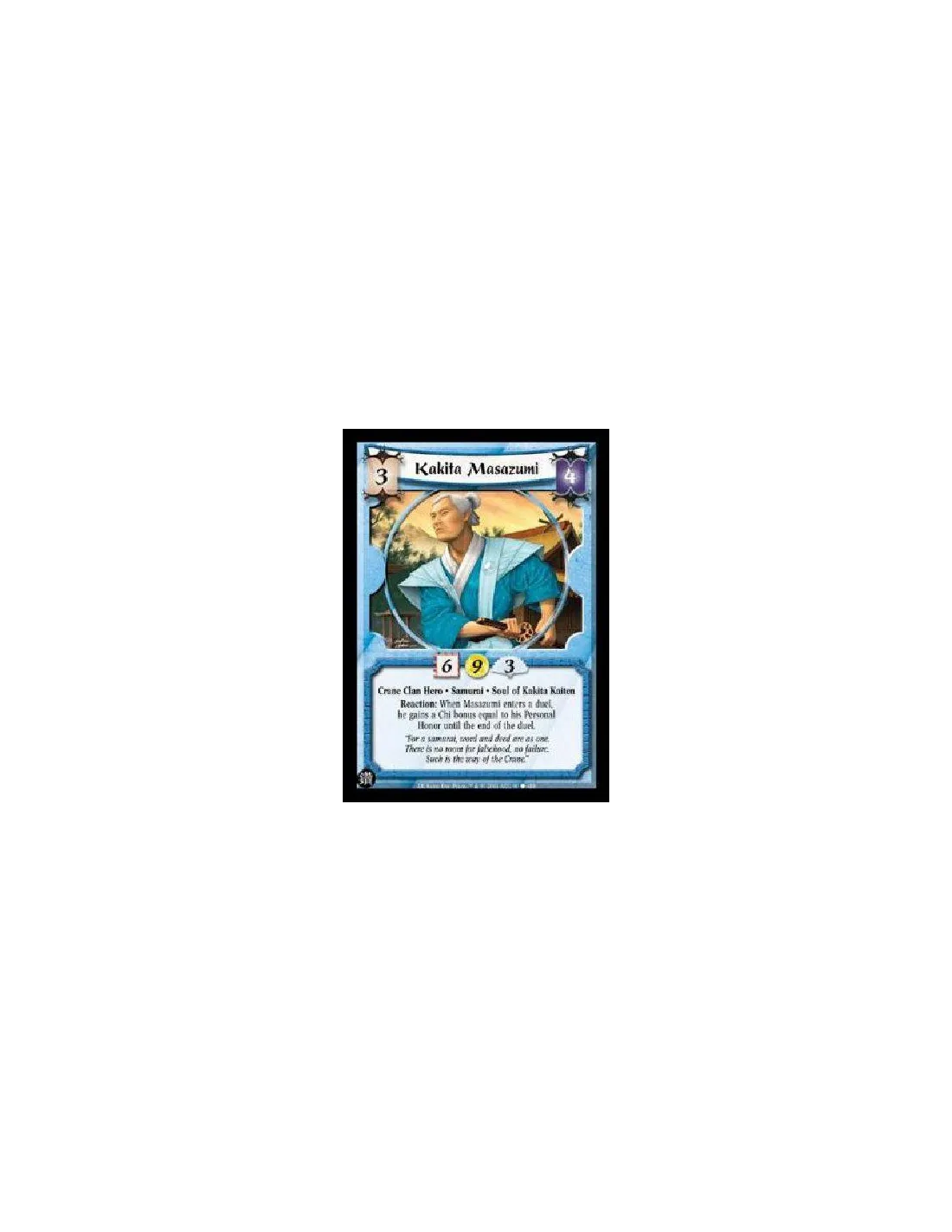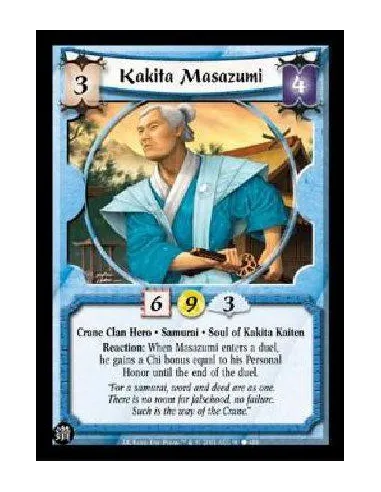 Crane Clan Hero . Samurai . Soul of Kakita Kaiten Reaction: When Masazumi enters a duel, he gains a Chi bonus equal to his Personal Honor until the end of the duel.