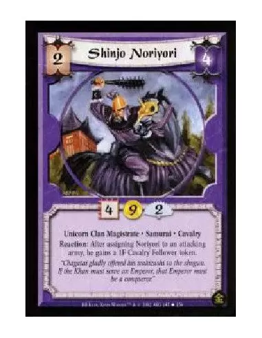 Unicorn Clan Magistrate. Samurai. Cavalry Reaction: After Noriyori is assigned to an attacking army, he gains a 1F Cavalry Follower token.