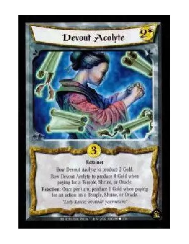Retainer Bow Devout Acolyte to produce 2 Gold. Bow Devout Acolyte to produce 4 Gold when paying for a Temple, Shrine, or Oracle. Reaction: Once per turn, produce 1 Gold when paying for an action on a Temple, Shrine, or Oracle.