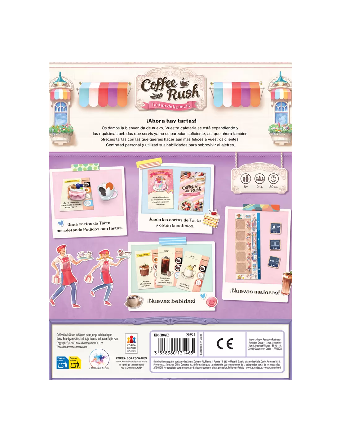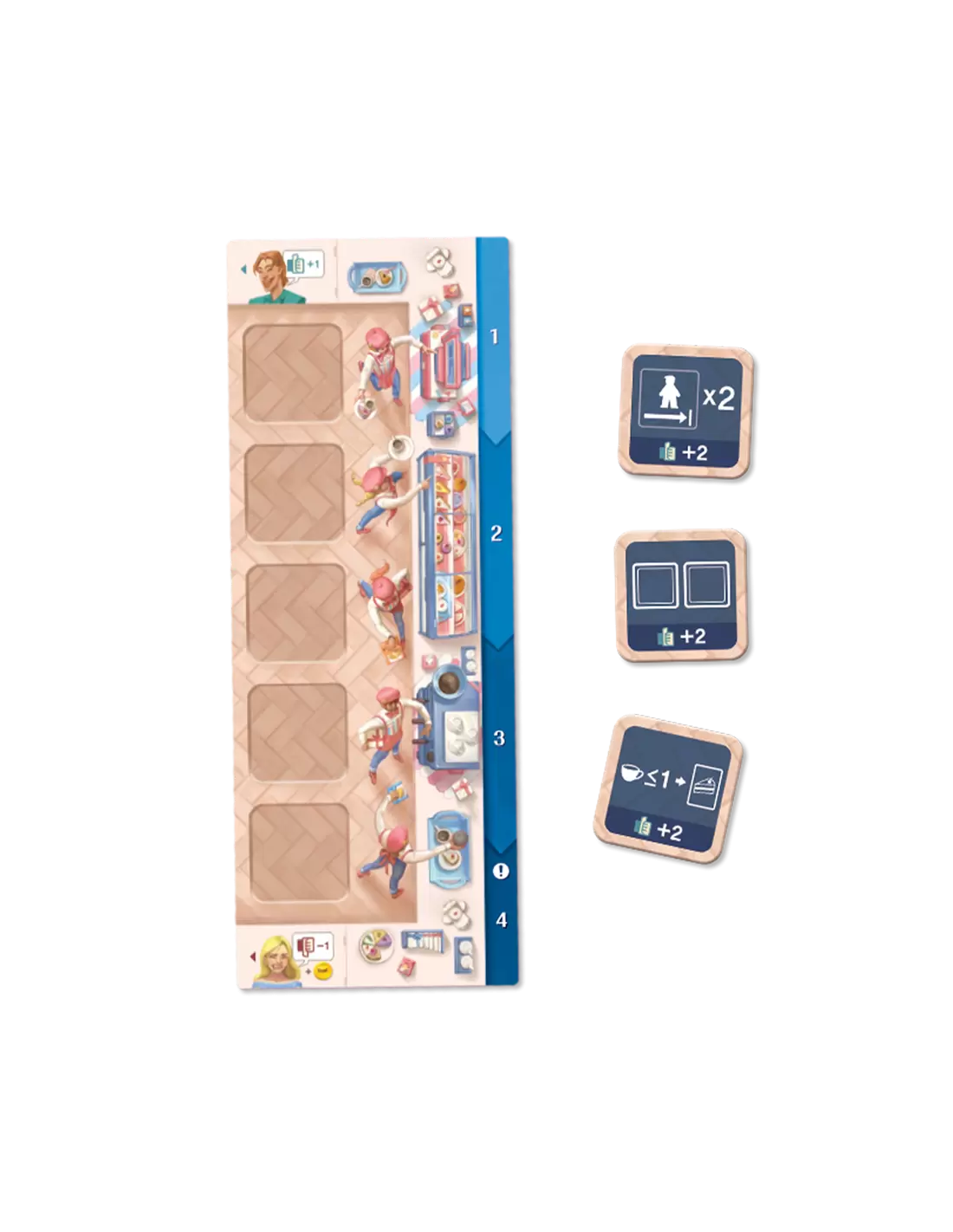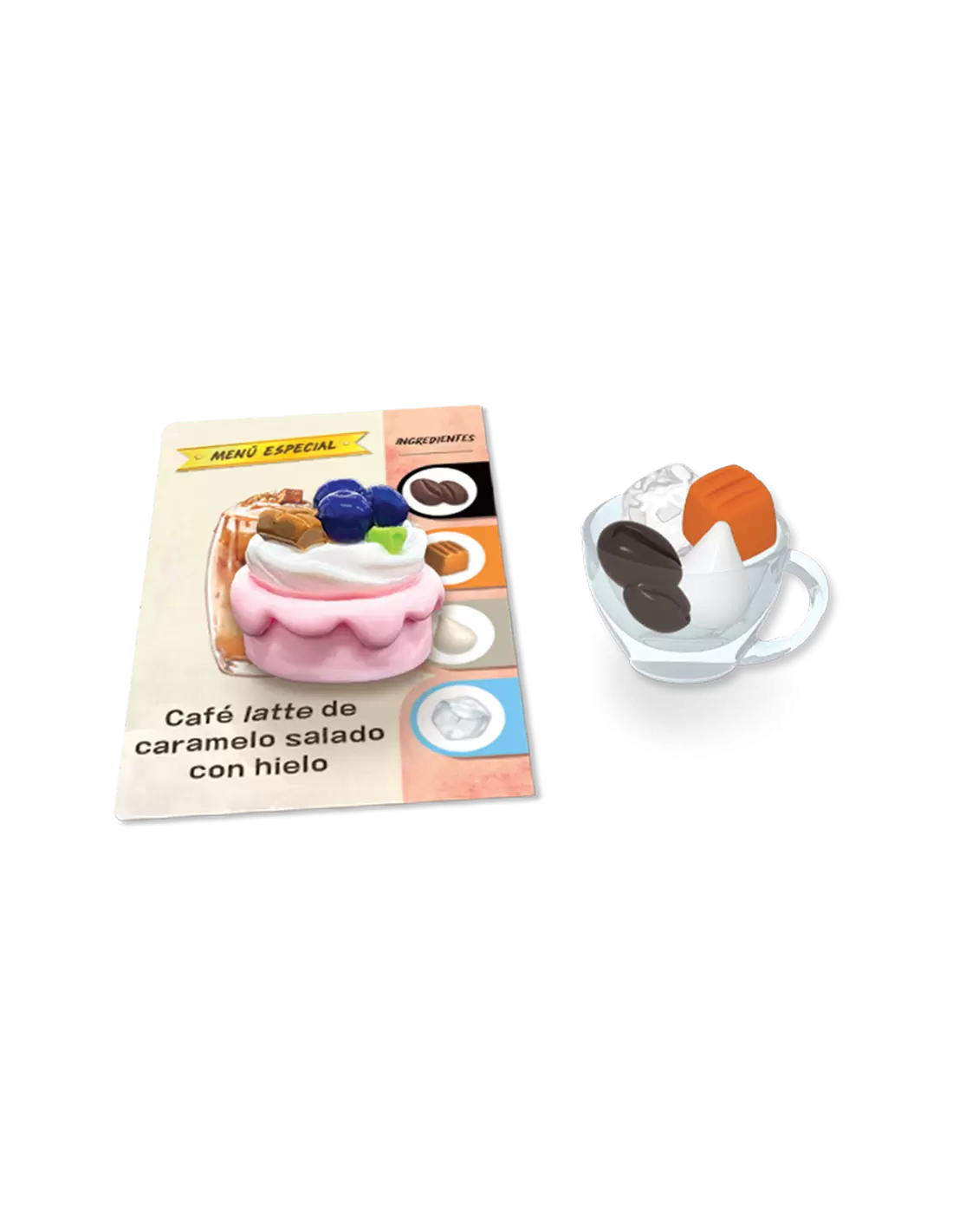 Tablero de Ingredientes x 1, tableros individuales x 4, fichas de Mejora x 16 (4 de cada color: rojo, azul, verde y amarillo), peones x 6 (2 rojos, 2 azules, 1 verde y 1 amarillo), reglamento x 1, bandejas para ingredientes x 2, cartas de Pedido x 80, tazas x 12, granos de café x 18, leche x 12, vapor x 12, hielo x 12. chocolate x 12, caramelo x 12, hojas de té x 12, agua x 12, fichas de Ingrediente x 102, fichas de Rapidez x 15, marcador de Jugador inicial x 1.