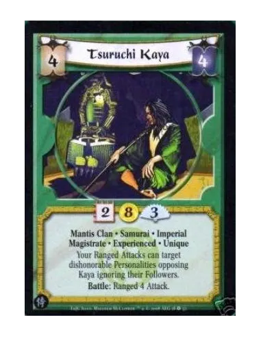 Mantis Clan • Samurai • Magistrate Imperial • Experienced • Unique Your Ranged Attacks can target dishonorable Personalities opposing Kaya ignoring their Followers. Battle: Ranged 4 Attack.