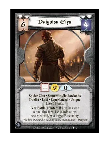 Spider Clan • Samurai • Shadowlands Duelist • Lost • Experienced • Unique Lose 5 Honor. Fear Battle/Limited: If Eiya has won a duel this turn: He growls at his next victim. Bow a target Personality.