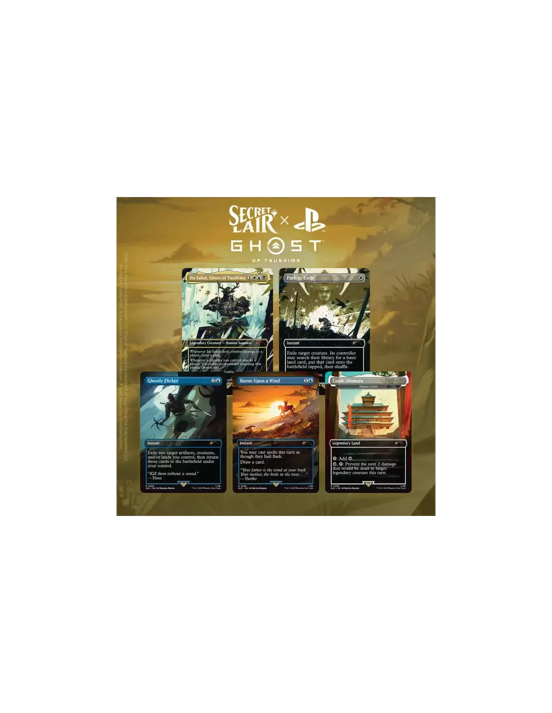 The story of Jin Sakai’s journey to become the Ghost of Tsushima resonated deeply with fans in 2020. His path was one of self-discovery, tragedy, and redemption. As fans prepare for the highly anticipated Ghost of Yotei, Secret Lair is proud to bring the characters and themes of Ghost of Tsushima to Magic: The Gathering with this drop.