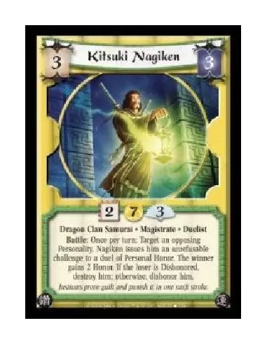 Dragon Clan Samurai · Magistrate · Duelist. Battle: Once per turn: Target an opposing Personality. Nagiken issues him an unrefusable challenge to a duel of Personal Honor. The winner gains 2 Honor. If the loser is Dishonored, destroy him; otherwise, dishonor him.