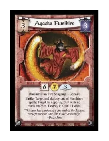 Phoenix Clan Fire Shugenja · Gozoku. Battle: Target and destroy one of Fumihiro's Spells: Target an opposing card with no cards attached. Destroy it. Gain 2 Honor