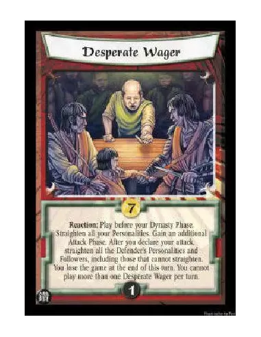 Reaction: Play before your Dynasty Phase. Straighten all your Personalities. Gain an additional Attack Phase. After you declare your attack, straighten all the Defender's Personalities and Followers, including those that cannot straighten. You lose the game at the end of this turn. You cannot play more than one Desperate Wager per turn.