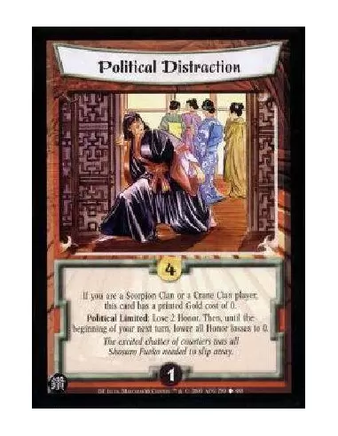 If you are a Scorpion Clan or a Crane Clan player, this card has a printed Gold cost of 0. Political Limited: Lose 2 Honor. Then, until the beginning of your next turn, lower all Honor losses to 0.