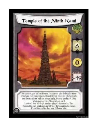 You cannot gain or lose Honor. You cannot take Political actions or actions that cause unconditional Honor losses to other players. Your Personalities will not swear fealty. Bow to produce 4 Gold when paying for a Shadowlands card. Limited: If you control a Personality, bow the Temple to target another player's Personality. The target may challenge any of your Personalities to a duel. If he does not, dishonor him.