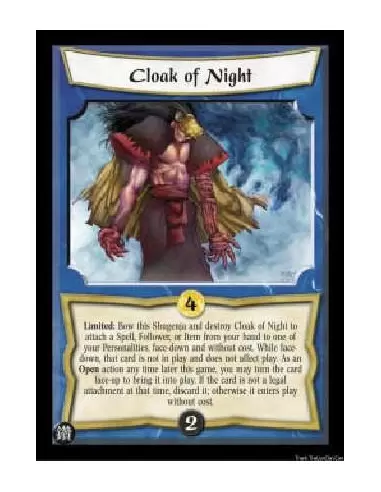 Limited: Bow this Shugenja and destroy Cloak of Night to attach a Spell, Follower, or Item from your hand to one of your Personalities, face-down and without cost. While face-down, that card is not in play and does not affect play. As an Open action any time later this game, you may turn the card face-up to bring it into play. If the card is not a legal attachment at that time, discard it; otherwise it enters play without cost.
