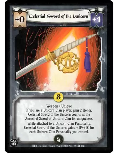Weapon * Unique If you are a Unicorn Clan player, gain 2 Honor. Celestial Sword of the Unicorn counts as the Ancestral Sword of Unicorn Clan for uniqueness. While attached to a Unicorn Clan Personality, Celestial Sword of the Unicorn gains +1F/+1C for each Unicorn Clan Personality you control.