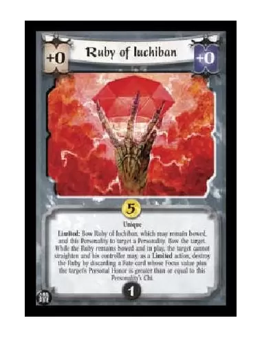 Unique Limited: Bow Ruby of Iuchiban, which may remain bowed, and this Personality to target a Personality. Bow the target. While the Ruby remains bowed and in play, the target cannot straighten and his controller may, as a Limited action, destroy the Ruby by discarding a Fate card whose Focus value plus the target's Personal Honor is greater than or equal to this Personality's Chi.
