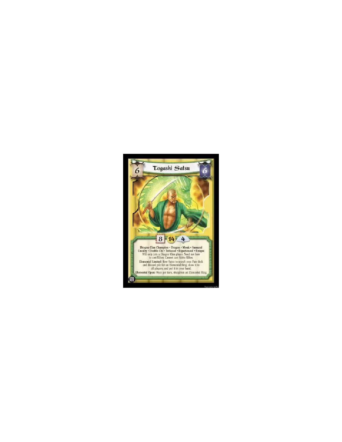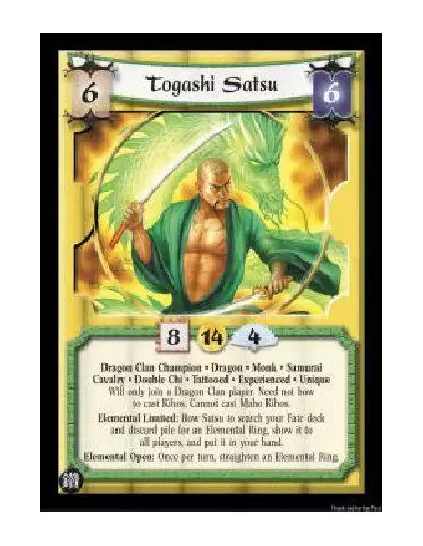 Dragon Clan Champion * Dragon * Monk * Samurai Cavalry * Double Chi * Tattooed * Experienced * Unique Will only join a Dragon Clan player. Need not bow to cast Kihos. Cannot cast Maho Kihos. Elemental Limited: Bow Satsu to search your Fate deck and discard pile for an Elemental Ring, show it to all players, and put it in your hand. Elemental Open: Once per turn, straighten an Elemental Ring.