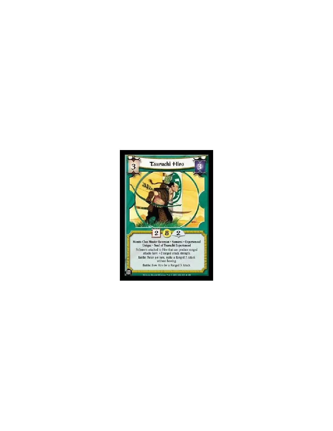 Mantis Clan Master Bowman * Samurai * Experienced Unique * Soul of Tsuruchi Experienced Followers attached to Hiro that can produce ranged attacks have +2 ranged attack strength. Battle: Twice per turn, make a Ranged 2 Attack without bowing. Battle: Bow Hiro for a Ranged 5 Attack.