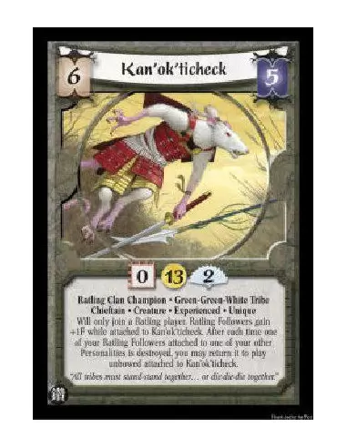 Ratling Clan Champion . Green-Green-White Tribe Chieftain . Creature . Experienced . Unique Will only join a Ratling player. Ratling Followers gain +1F while attached to Kan'ok'ticheck. After each time one of your Ratling Followers attached to one of your other Personalities is destroyed, you may return it to play unbowed attached to Kan'ok'ticheck.