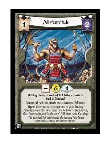 Ratling Guide * Crooked Tail Tribe * Creature Soul of Mack'uk Nir'um'tuk will not attach more than one Follower. Open: Once per turn, target one of your Ratling Personalities with fewer than two Followers. Nir'um'tuk, that Personality, and both units' Followers gain Cavalry.