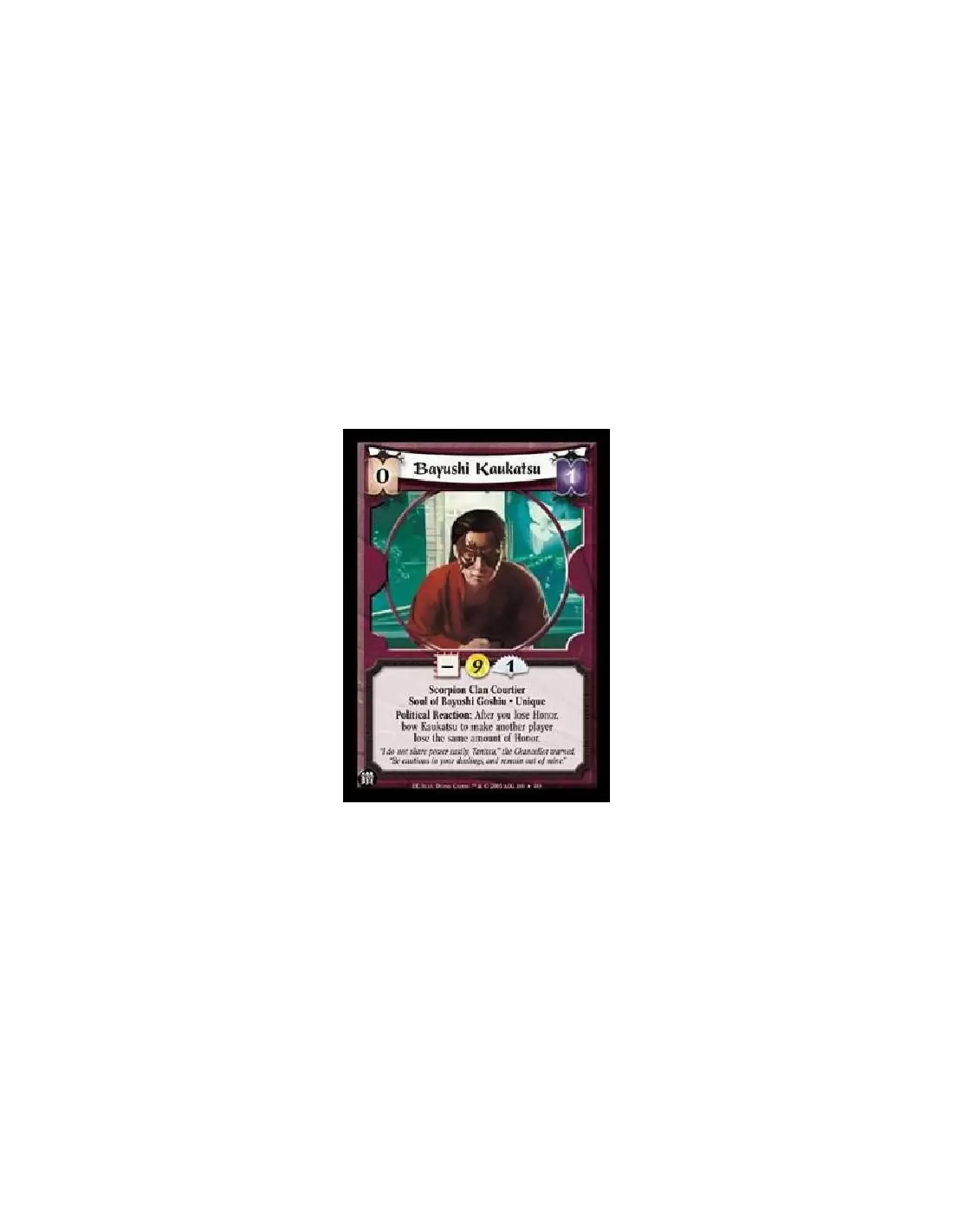 Scorpion Clan Courtier Soul of Bayushi Goshiu * Unique Political Reaction: After you lose Honor, bow Kaukatsu to make another player lose the same amount of Honor.