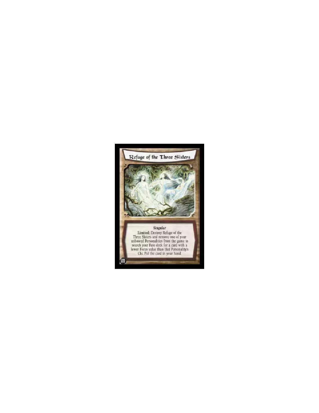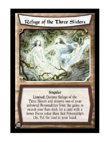 Singular Limited: Destroy Refuge of the Three Sisters and remove one of your unbowed Personalities from the game to search your Fate deck for a card with a lower Focus value than that Personality's Chi. Put the card in your hand.