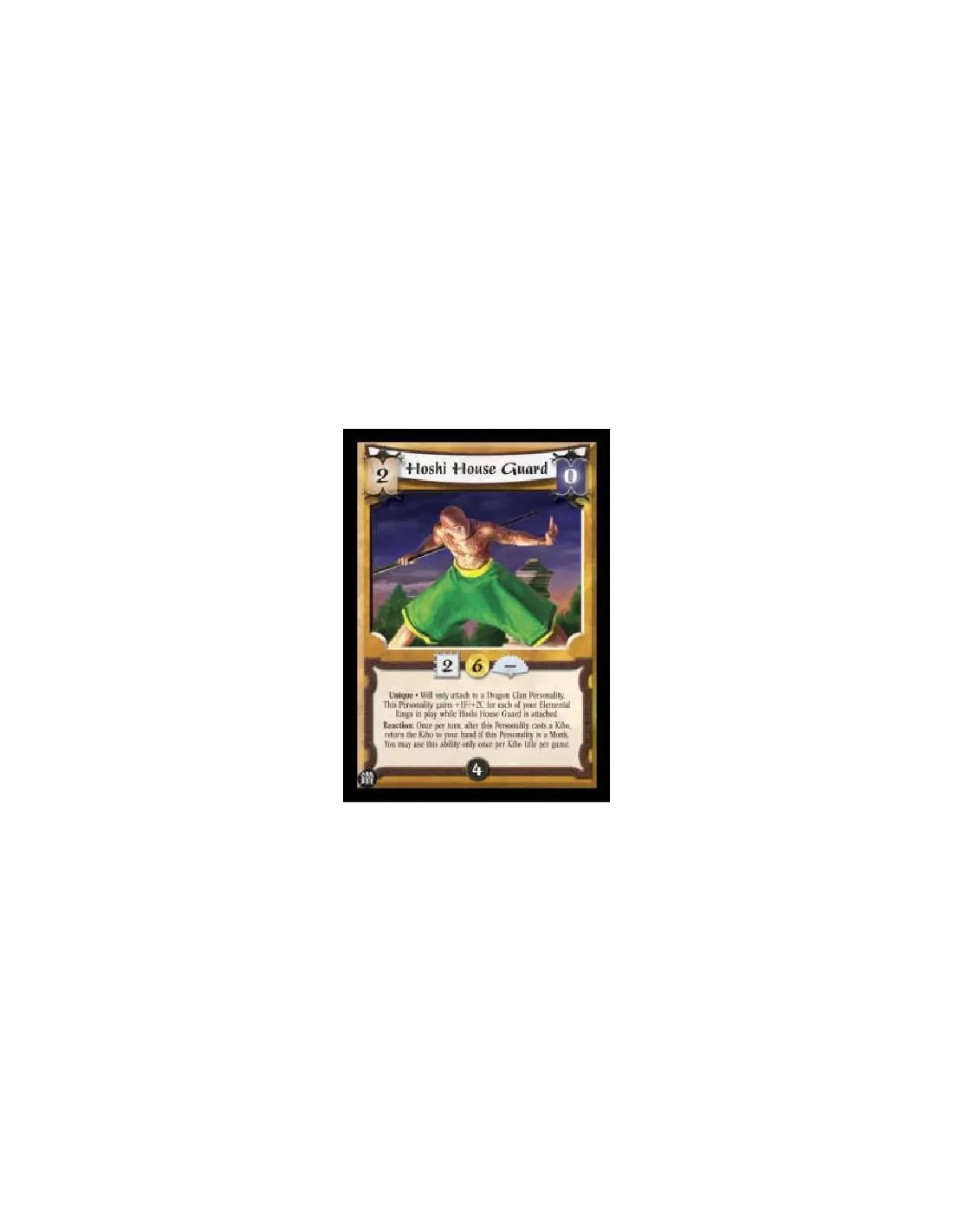 Unique * Will only attach to a Dragon Clan Personality. This Personality gains +1F/+2C for each of your Elemental Rings in play while Hoshi House Guard is attached. Reaction: Once per turn, after this Personality casts a Kiho, return the Kiho to your hand if this Personality is a Monk. You may use this ability only once per Kiho title per game.