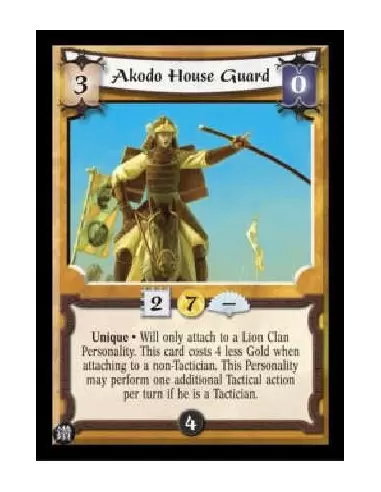 Unique Will only attach to a Lion Clan Personality. This card costs 4 less Gold when attaching to a non-Tactician. This Personality may perform one additional Tactical action per turn if he is a Tactician.