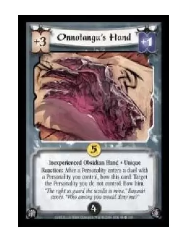 Inexperienced Obsidian Hand · Unique. Reaction: After a Personality enters a duel with a Personality you control, bow this card: Target the Personality you don not control. Bow him.