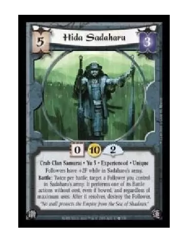 Crab Clan Samurai · Yu 5 · Experienced · Unique. Followers have +2F while in Sadaharu's army. Battle: Twice per battle, target a Follower you control in Sadaharu's army. It performs one of its Battle actions without cost, even if bowed, and regardless of maximum uses. After it resolves, destroy the Follower