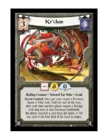 Ratling Creature · Tattered Ear Tribe · Scout. Recon Limited: Once per turn, target a Province. Name a Tribe trait. Until the end of the turn, after each time another player targets a Ratling with that trait at that Province's battlefield, the player discards a card from his hand, or the top card of his Fate deck if his hand is empty.