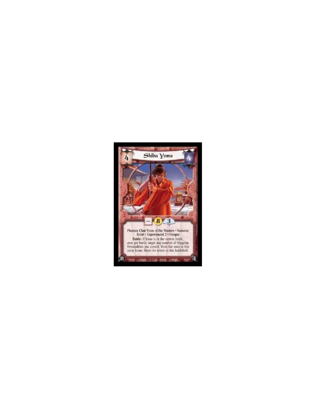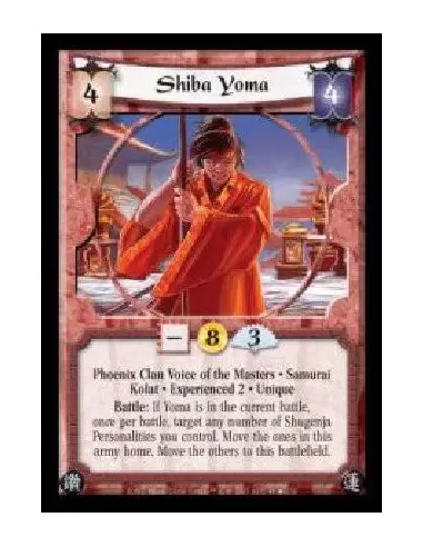Phoenix Clan Voice of the Masters · Samurai · Kolat · Experienced 2 · Unique. Battle: If Yoma is in the current battle, once per battle, target any number of Shugenja Personalities you control. Move the ones in this army home. Move the others to this battlefield.
