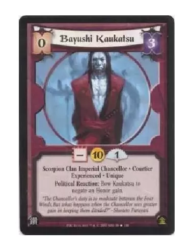 Scorpion Clan Imperial Chancellor * Courtier Experienced * UniquePolitical Reaction: Bow Kaukatsu to negate an Honor gain.
