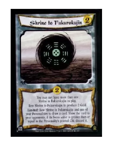 You may not have more than one Shrine to Fukurokujin in play.Bow Shrine to Fukurokujin to produce 2 Gold.Limited: Bow Shrine to Fukurokujin and one of your Personalities to draw a card. Show the card to your opponents; if its Focus value is greater than or equal to the Personality's printed Chi, discard it.