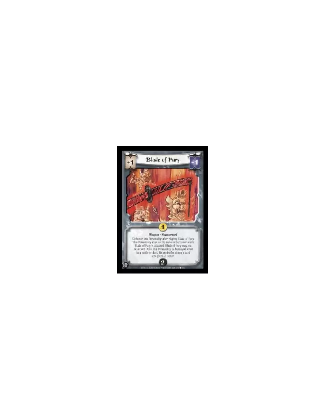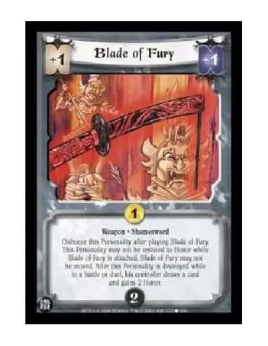 Weapon. Shamesword Dishonor this Personality after playing Blade of Fury. This Personality may not be restored to Honor while Blade of Fury is attached. Blade of Fury may not be moved. After this, Personality is destroyed while in a battle or duel, his controller draws a card and gains 2 Honor.