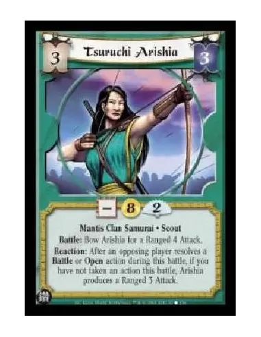 Mantis Clan Samurai . Scout Battle: Bow Arishia for a Ranged 4 Attack. Reaction: After an opposing player resolves a Battle or Open action during this battle, if you have not taken an action this battle, Arishia produces a Ranged 3 Attack.