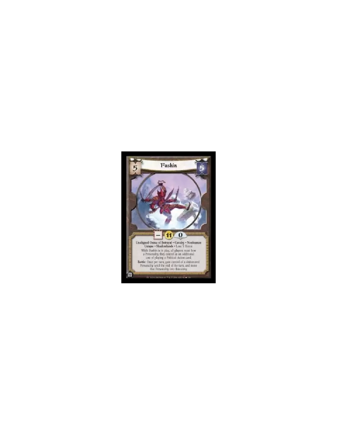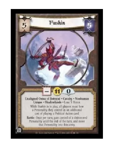 Unaligned Onisu of Betrayal . Cavalry . Nonhuman Unique . Shadowlands . Lose 5 Honor. While Fushin is in play, all players must bow a Personality they control as an additional cost of playing a Political Action card. Battle: Once per turn, gain control of a dishonored Personality until the end of the turn, and move that Personality into this army.