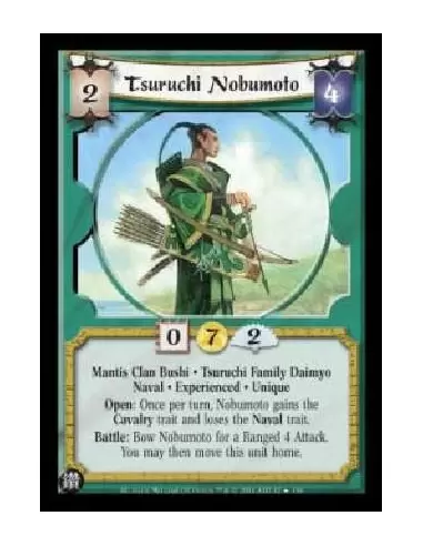 Mantis Clan Bushi . Tsuruchi Family Daimyo Naval . Experienced . Unique Open: Once per turn, Nobumoto gains the Cavalry trait and loses the Naval trait. Battle: Bow Nobumoto for a Ranged 4 Attack. You may then move this unit home.