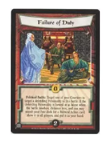 Political Battle: Target one of your Courtiers to target a defending Personality in this battle. If the defending Personality is bowed or at home when the battle resolves, dishonor him, and you may search your Fate deck for a Political Action card, show it to all players, and put it in your hand.