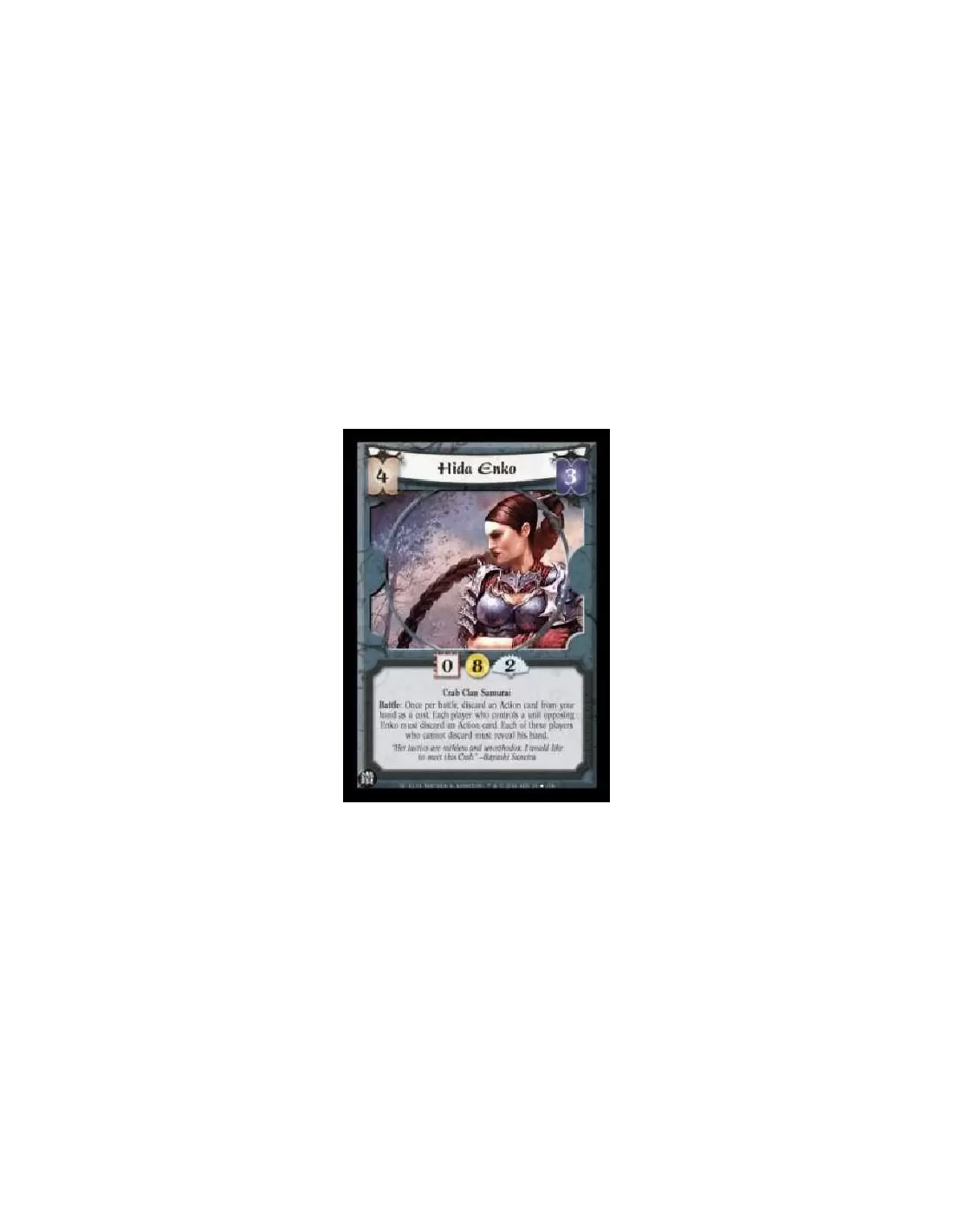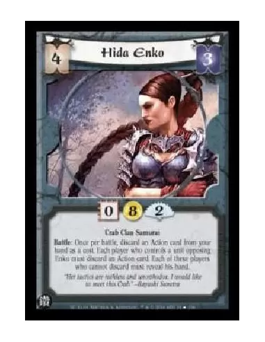 Crab Clan Samurai Battle: Once per battle, discard an Action card from your hand as a cost. Each player who controls a unit opposing Enko must discard an Action card. Each of these players who cannot discard must reveal his hand.