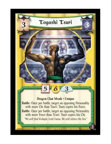Dragon Clan Monk · Unique. Battle: Once per battle, target an opposing Personality with more Chi than Tsuri: Tsuri copies his Force. Battle: Once per battle, target an opposing Personality with more Force than Tsuri: Tsuri copies his Chi.