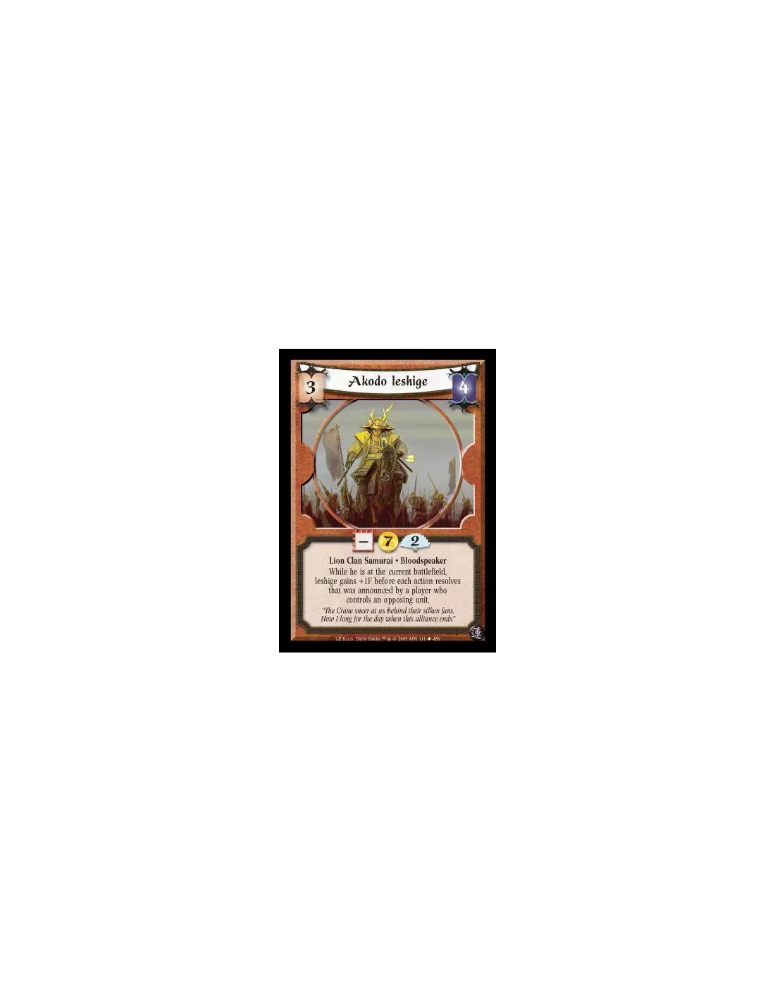 Lion Clan Samurai · Bloodspeaker. While he is at the current battlefield, Ieshige gains +1F before each action resolves that was announced by a player who controlled an opposing unit