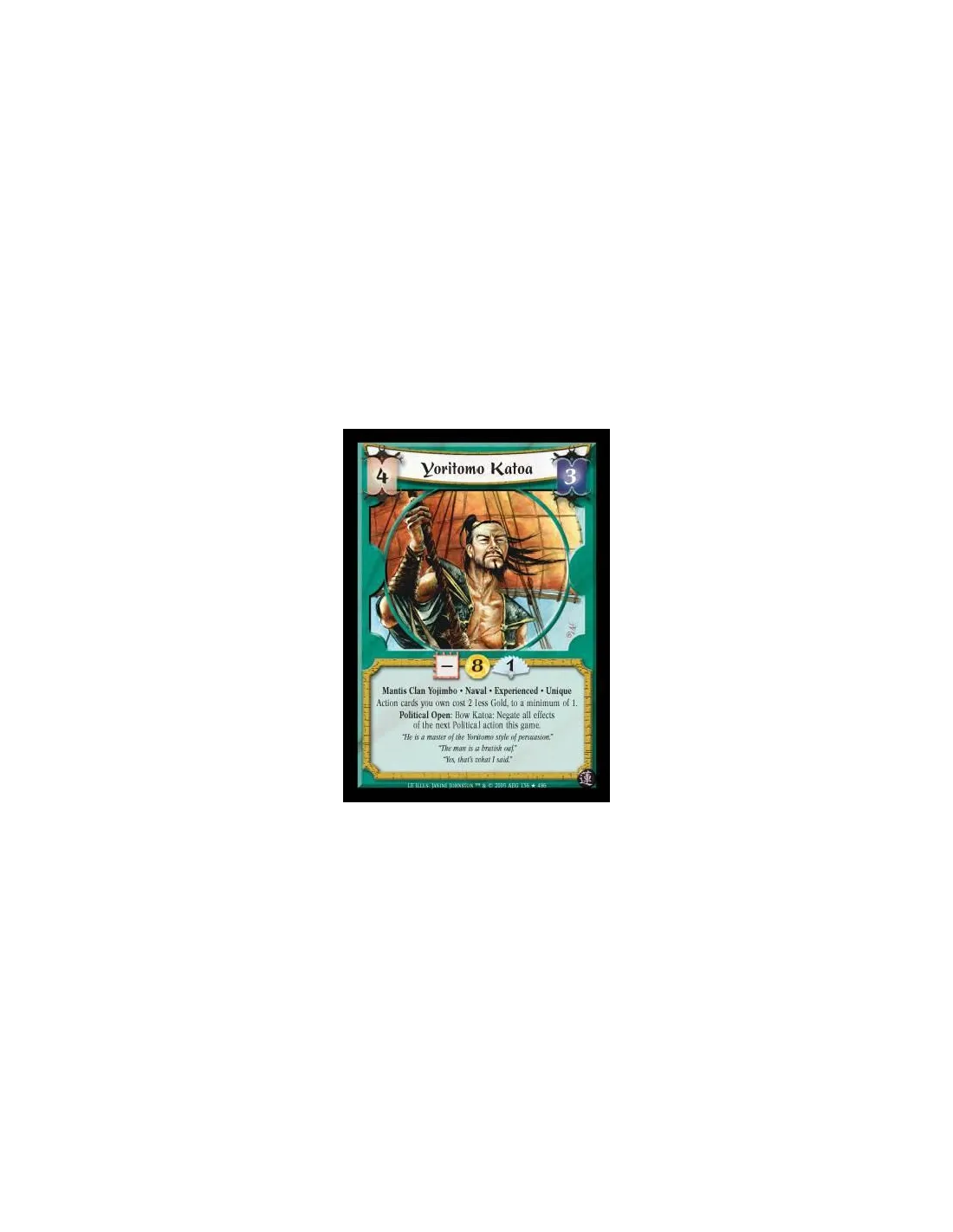 Mantis Clan Yojimbo · Naval · Experienced · Unique. Action cards you own cost 2 less Gold, to a minimum of 1. Political Open: Bow Katoa: Negate all effects of the next Political action this game.