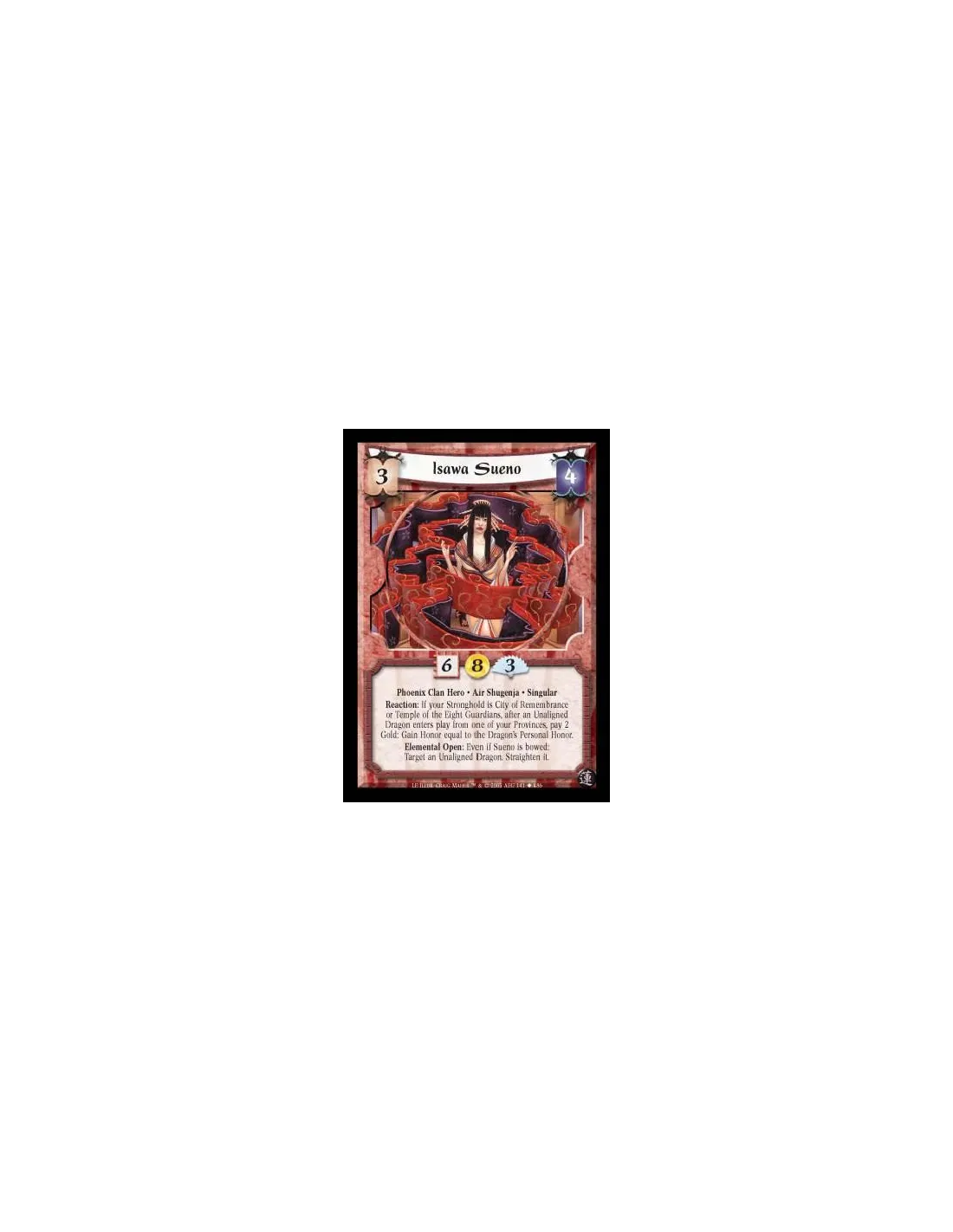 Phoenix Clan Hero · Air Shugenja · Singular. Reaction: If your Stronghold is City of Remembrance or Temple of the Eight Guardians, after an Unaligned Dragon enters play from one of your Provinces, pay 2 Gold: Gain Honor equal to the Dragon's Personal Honor. Elemental Open: Even if Sueno is bowed: Target an Unaligned Dragon. Straighten it