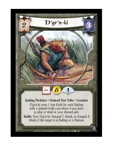 Ratling Predator · Stained Paw Tribe · Creature. D'gr'n-ki costs 1 less Gold for each Ratling with a printed Gold cost above 6 you have in play or dead in your discard pile. Battle: Bow D'gr'n-ki: Ranged 2 Attack, or Ranged 4 Attack if the target is a Ratling or a Human.