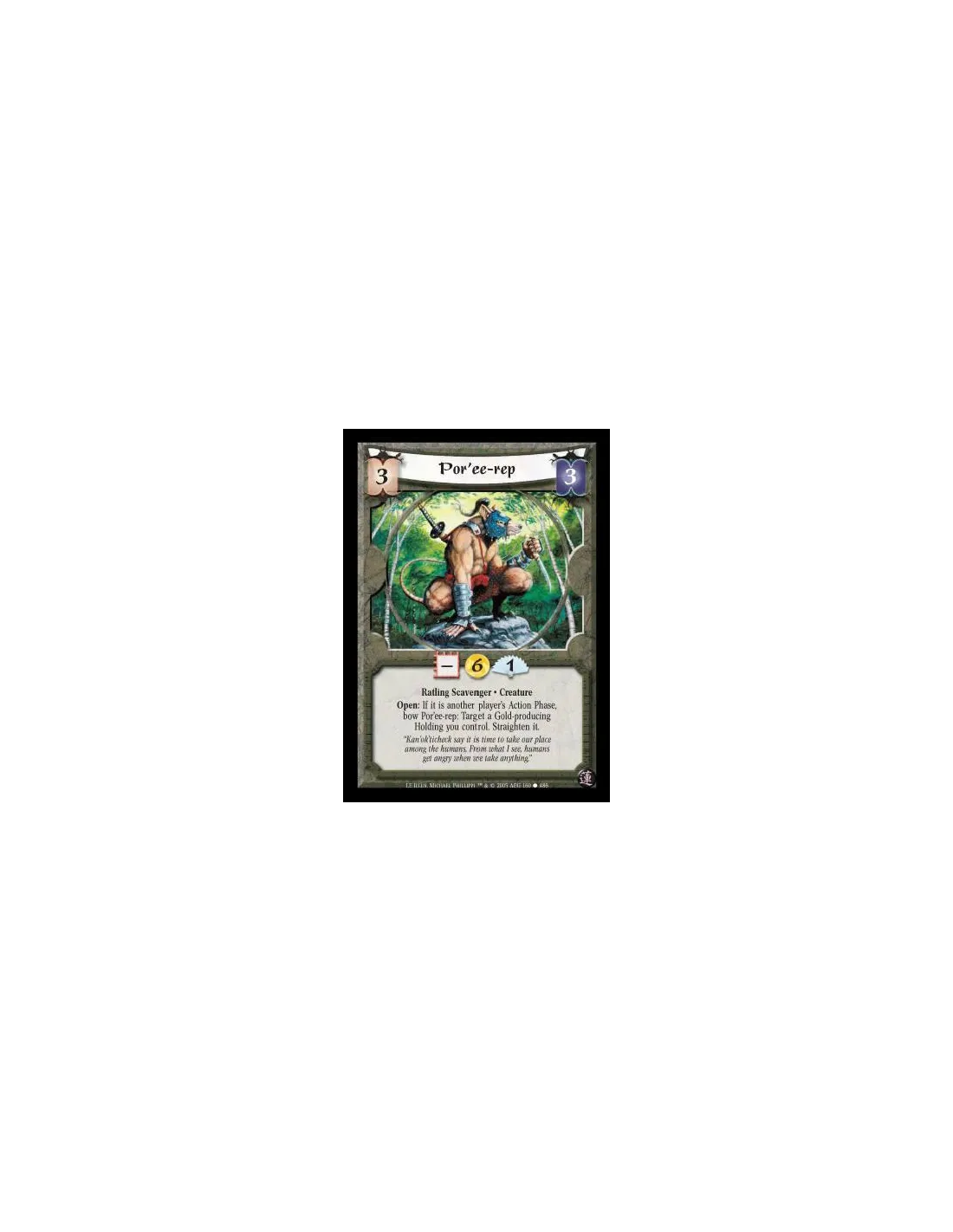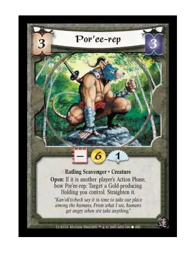 Ratling Scavenger · Creature. Open: If it is another player's Action Phase, bow Por'ee-rep: Target a Gold-producing Holding you control. Straighten it.