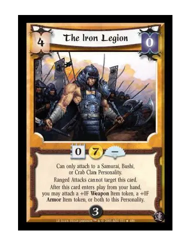 Will only attach to a Samurai, Bushi, or Crab Clan Personality. Ranged Attacks cannot target this card. After this card enters play from your hand, you may attach a +0F Weapon Item token, a +0F Armor Item token, or both to this Personality