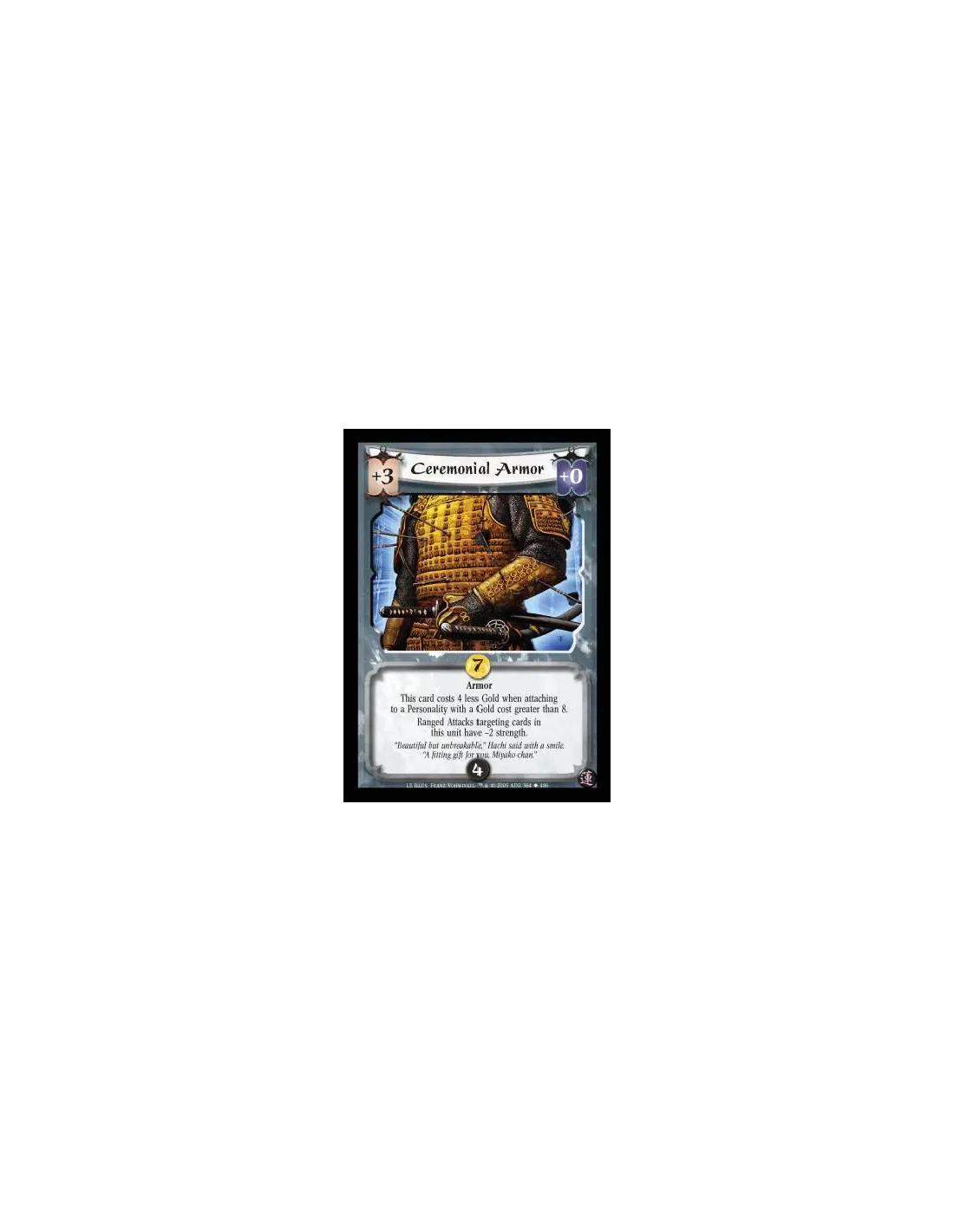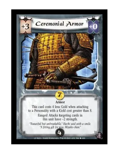 Armor. This card costs 4 less Gold when attaching to a Personality with a Gold cost greater than 8. Ranged Attacks targeting cards in this unit have -2 strength