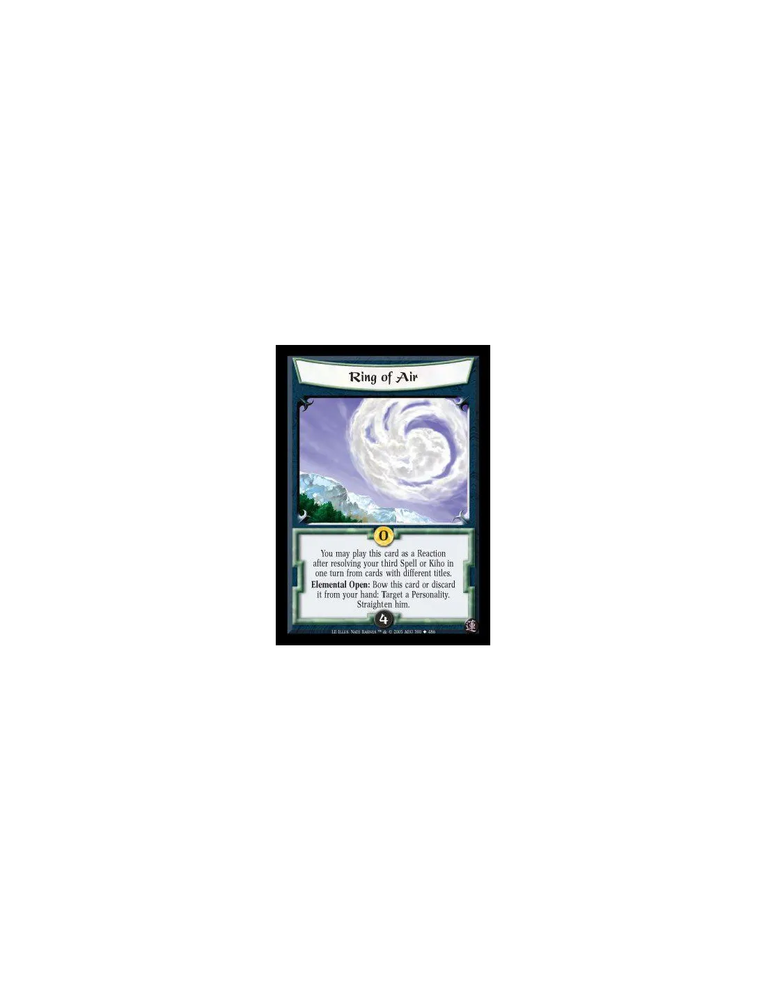 You may play this card as a Reaction after resolving your third Spell or Kiho in one turn from cards with different titles. Elemental Open: Bow this card or discard it from your hand: Target a Personality. Straighten him
